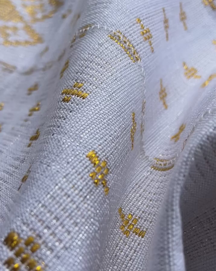 Designed in refined white and radiant gold, this Kente cloth is a masterpiece of artistry and distinction. Every thread is carefully woven to reflect grace, prestige, and cultural depth, creating a piece that feels timeless, regal, and truly elevated.”